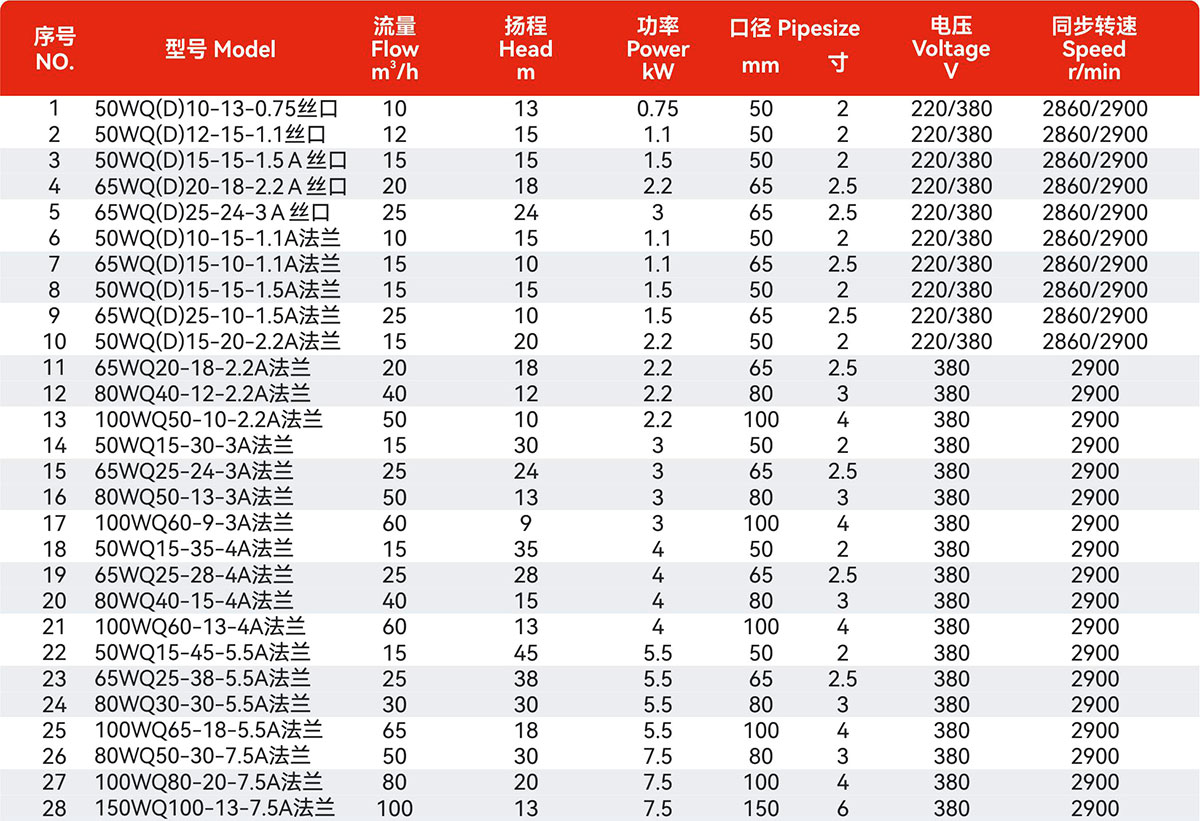WQ、WQD 型污水污物潜水电泵(以下简称电泵),由水泵、密封、电动机三部分组成。电动机位于电泵上部,为单相或三相异步电动机。水泵和电动机之间采用双端面机械密封,每个固定止口密封处采用“O”形耐油橡胶封圈作静密封。该系列电泵具有结构紧凑、流量大、效率高、使用方便等优点,关键部位的机械密封采用硬质合金和优质碳化硅为材料,具有良好的防腐蚀、防渗漏、经久耐用等特点。